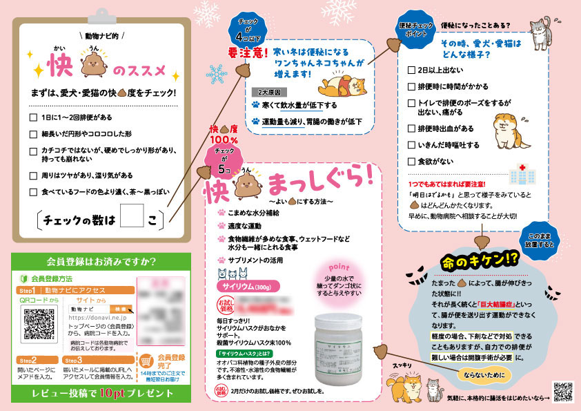 もう一つは、動物ナビの注文商品お届け荷物に同梱してお届けする方法です。飼い主様が「動物ナビ」商品購入するようになると、動物病院へ商品購入のための来院が少なくなりがちです。必要なタイミングで病院に行くことができるように、季節的な啓蒙を盛り込むようにしています。
