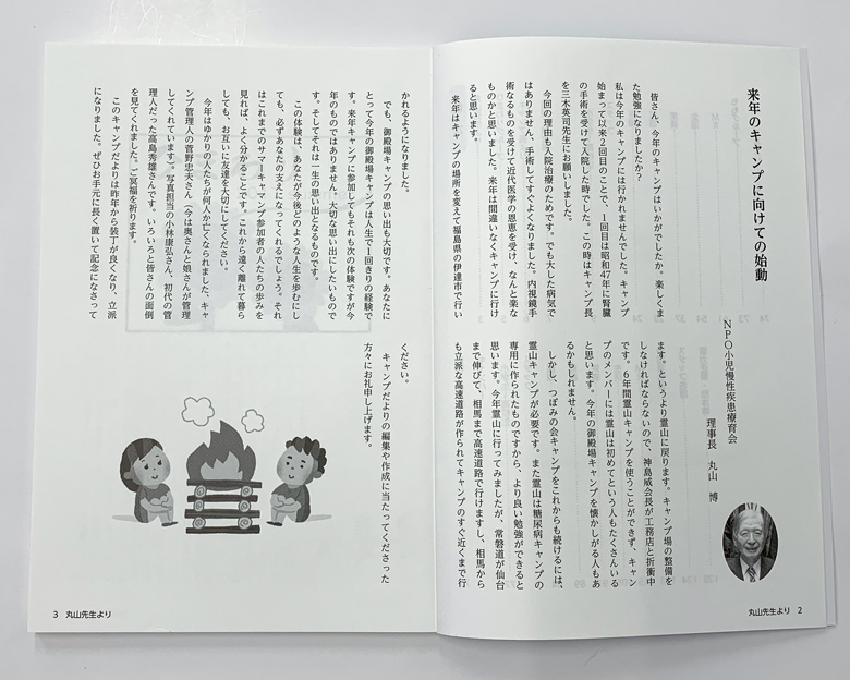 つぼみの会様(1型糖尿病の患者と家族の会)が夏に行うサマーキャンプ、そこに参加したお子さんが書いた感想文の文集を製作させていただきました。 お子さんの感想文用の専用原稿用紙を当社でご用意し、7月にお渡しして、8月のキャンプ日程中に書いていただき、キャンプ終了後にお引き取り。 データ化をして他のページ(参加者名簿など)と一緒に一冊として製作・編集。300部印刷して納品いたしました。