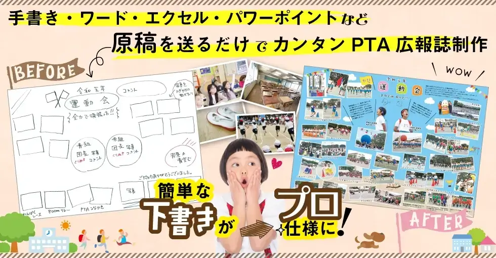 広報部の皆様に描いていただいた手書きラフを元にプロのデザイナーがPTA広報誌を制作致します。ワードやエクセル、パワーポイントなどで制作したものをプロがデザインすることも可能です。